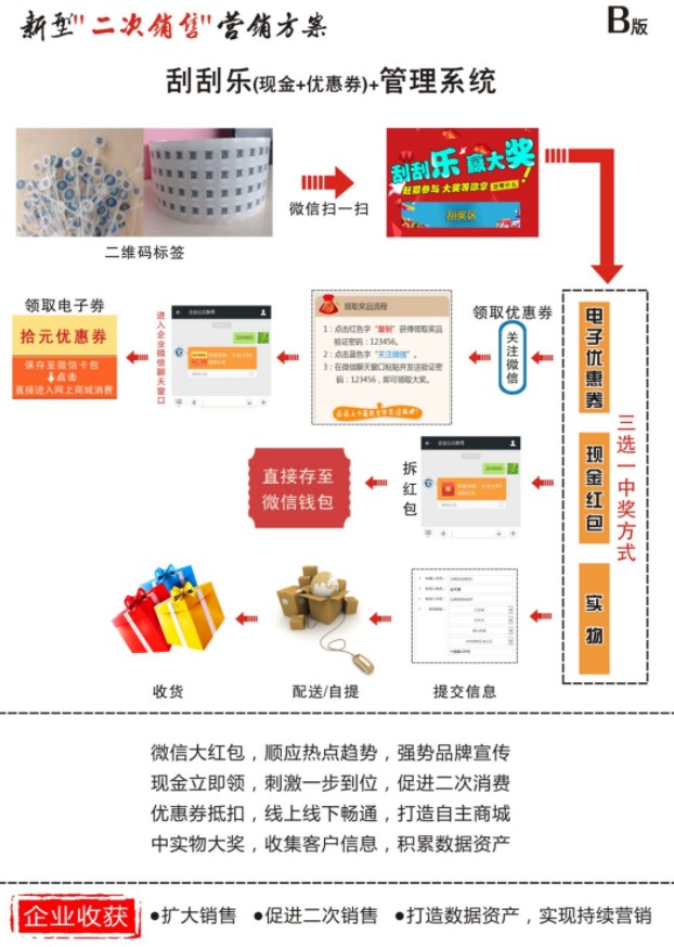 溯源营销管理系统:开发各类新鲜有趣的营销互动功能:如消费者扫码晋升会员,对企业经营和产品开发建言献策,并实实在在获得各类奖励;企业根据每位会员不同的人物画像,量身定制各种活动,包括产品鉴别、复购、使用指导、使用反馈、会员优惠等活动。最终,真正承担起企业、品牌方与广大消费者两端沟通的桥梁作用。(金禾通公司提供礼品券卡定制提货系统定制,产品抽奖二维码生产配码上有奖系统定制,企业产品溯源标签生产配溯源防伪管理系统)梁经理