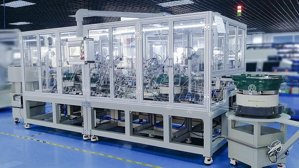 设备采用软性输送线进行装配,一键换型多款产品型号进行装配,实现产品自动化装配及自动检测。墙壁开关基座模块系列自动组装线 由组装钮子、钮子入压板、导电件与静触头入基座、动触头入基座、动触头打油等组合而成。振动盘送料开关基座组件和触头片物料放于上料装置,各物料自动上料;采用柔性传送将装配好的工位输送到下一工位,械手抓取组件放入底座中,压合五金件、检测,组装。提高生产效率、保证产品质量、节省人力成本。