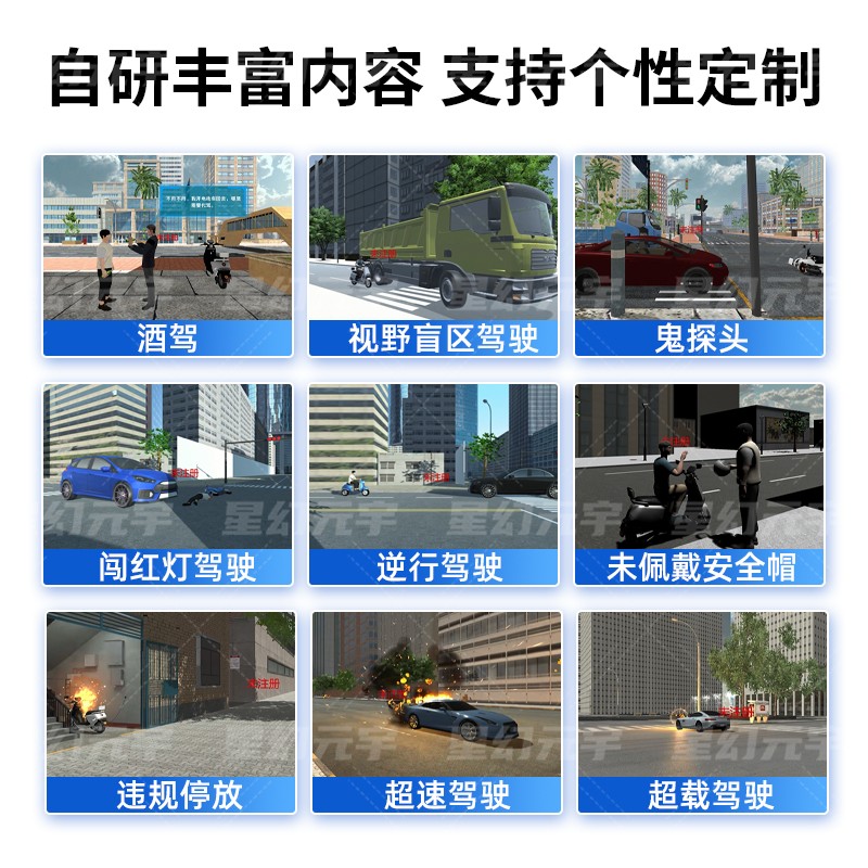 1.沉浸式体验感强:搭配高清 4K VR 头显与 43 寸宽阔大屏,结合真实动感车身与智能电力驱动平台,可模拟加速、刹车、转弯等真实骑行动作,还原酒驾、视野盲区、雨天行驶等多种场景,让用户以视角 “亲历” 危险,代入感远超传统教育形式。